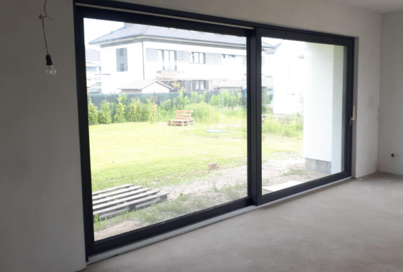 - Dolny salon duże przeszklenia na głównej ścianie dwa 3 metrowe okna otwierane na skrajnie domu w stylu: